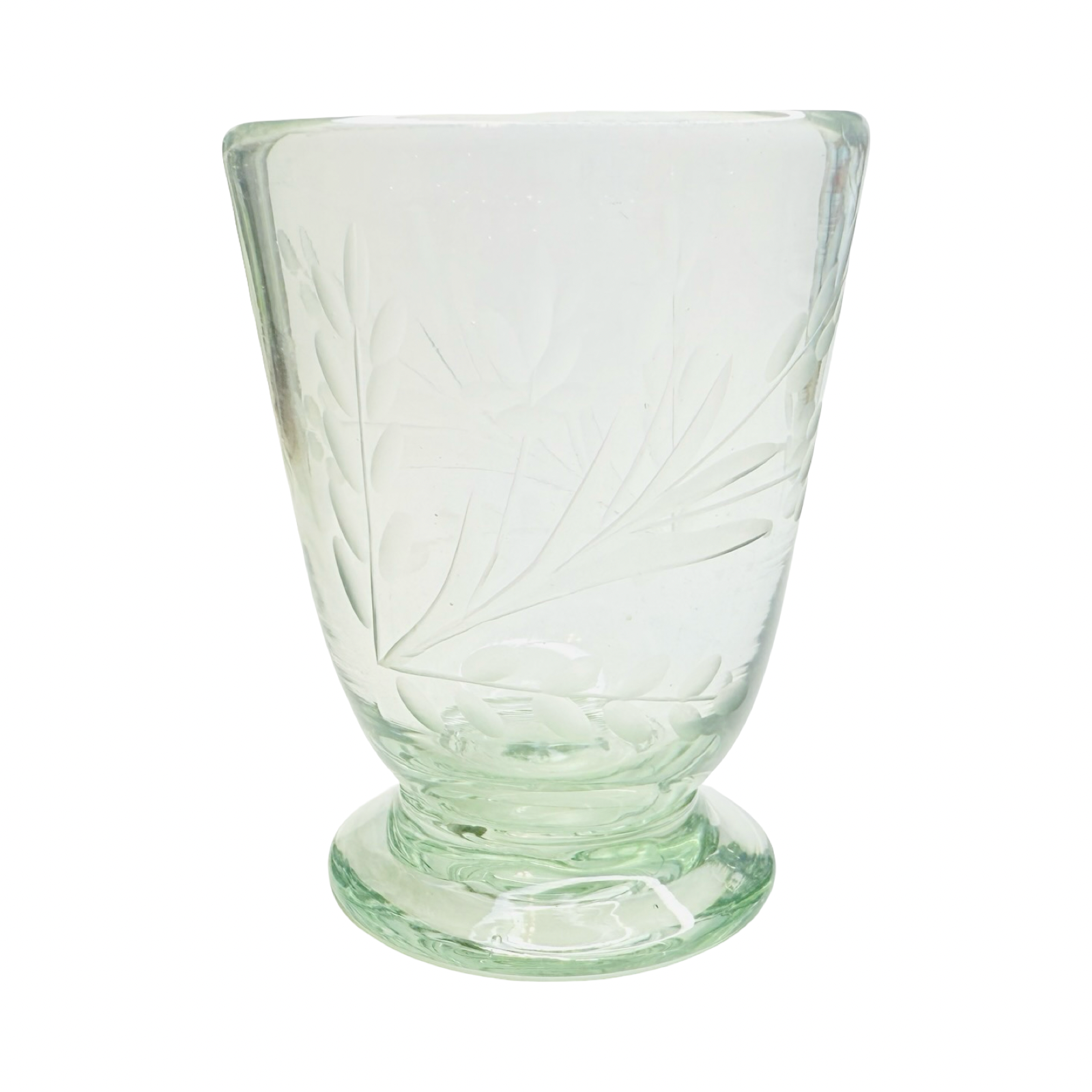 Elegant and timeless, this hand-etched footed glass is crafted from mouth-blown clear glass and adorned with a delicate botanical motif. Its petite pedestal base adds charm and stability, while the slightly flared rim provides a comfortable sip. Perfect for everyday use, it transitions effortlessly from morning juice to evening wine or even a casual floral display.