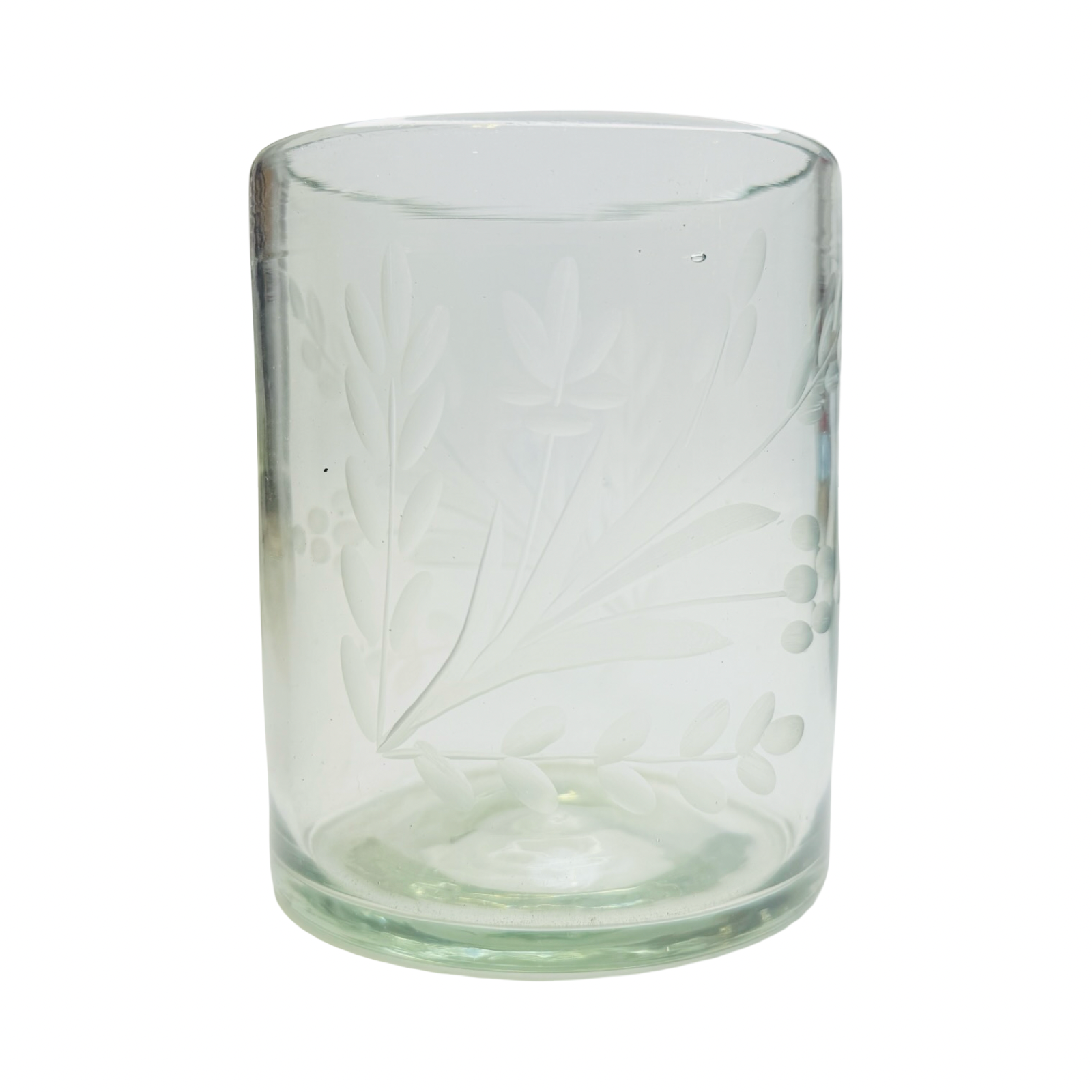 This clear, mouth-blown tumbler is etched by hand with a soft botanical motif that catches the light beautifully. The straight-sided shape feels sturdy in hand and suits everything from morning juice to evening cocktails, sparkling water, or a petite floral arrangement.