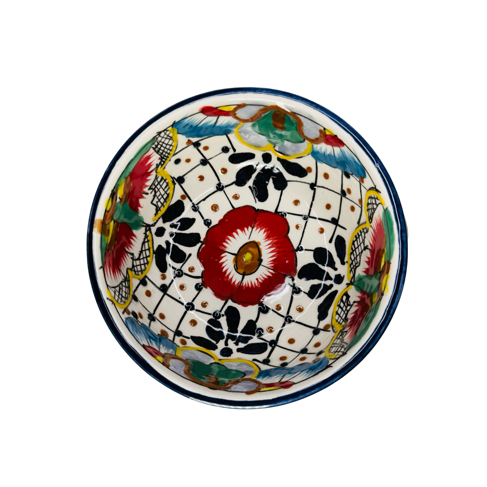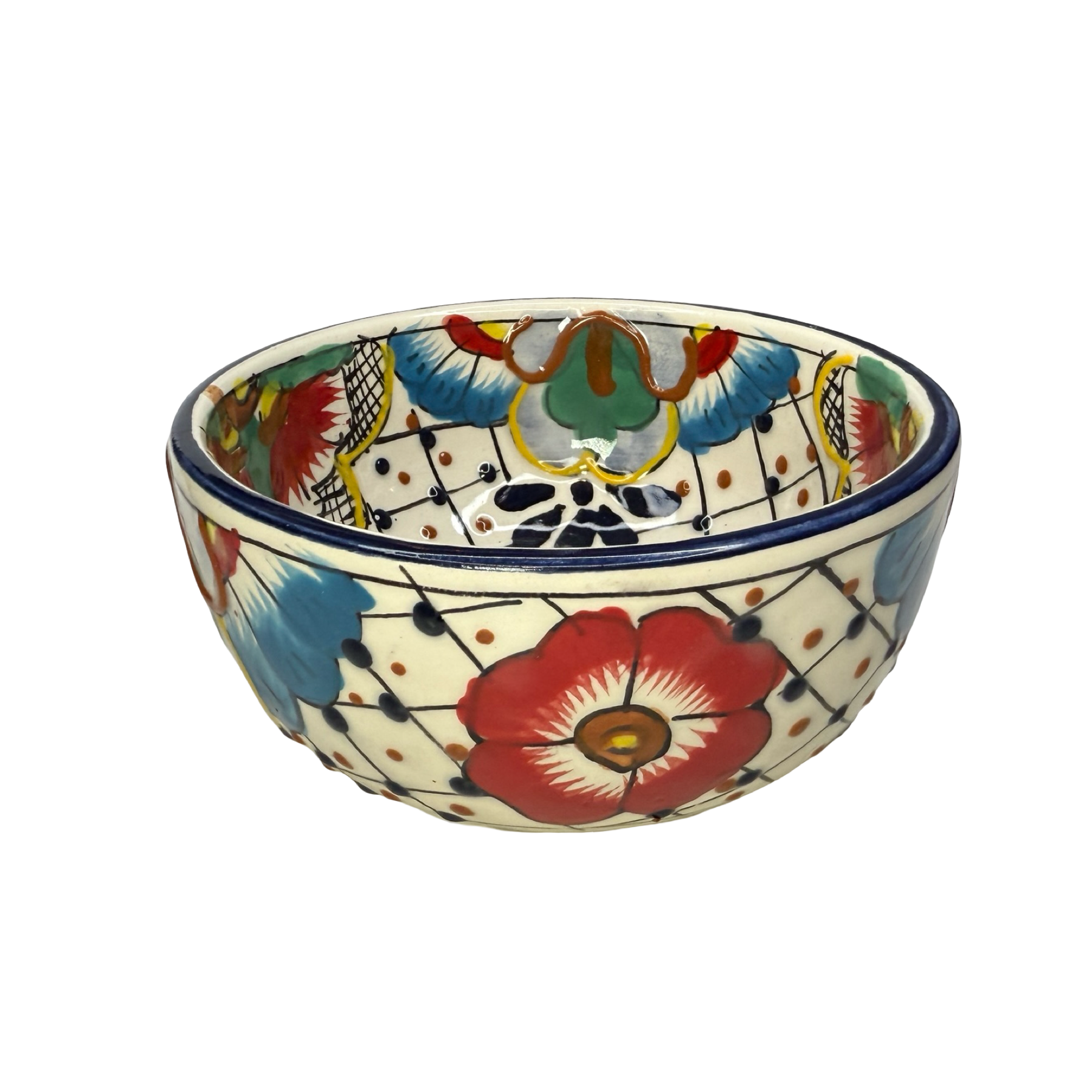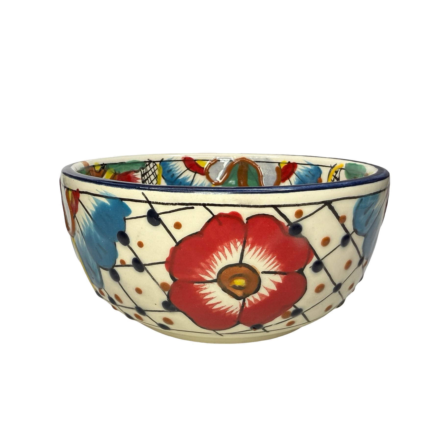 The Encantada Dots & Flowers Bowl is a cheerful addition to any table. Hand-painted with bright red flowers, leafy accents, and colorful dotted details on a cream background, this ceramic bowl is perfect for serving soups, cereals, snacks, or side dishes. Its lively design brings a festive touch to everyday meals and special occasions alike. Each piece is handmade by skilled artisans, making every one-of-a-kind.