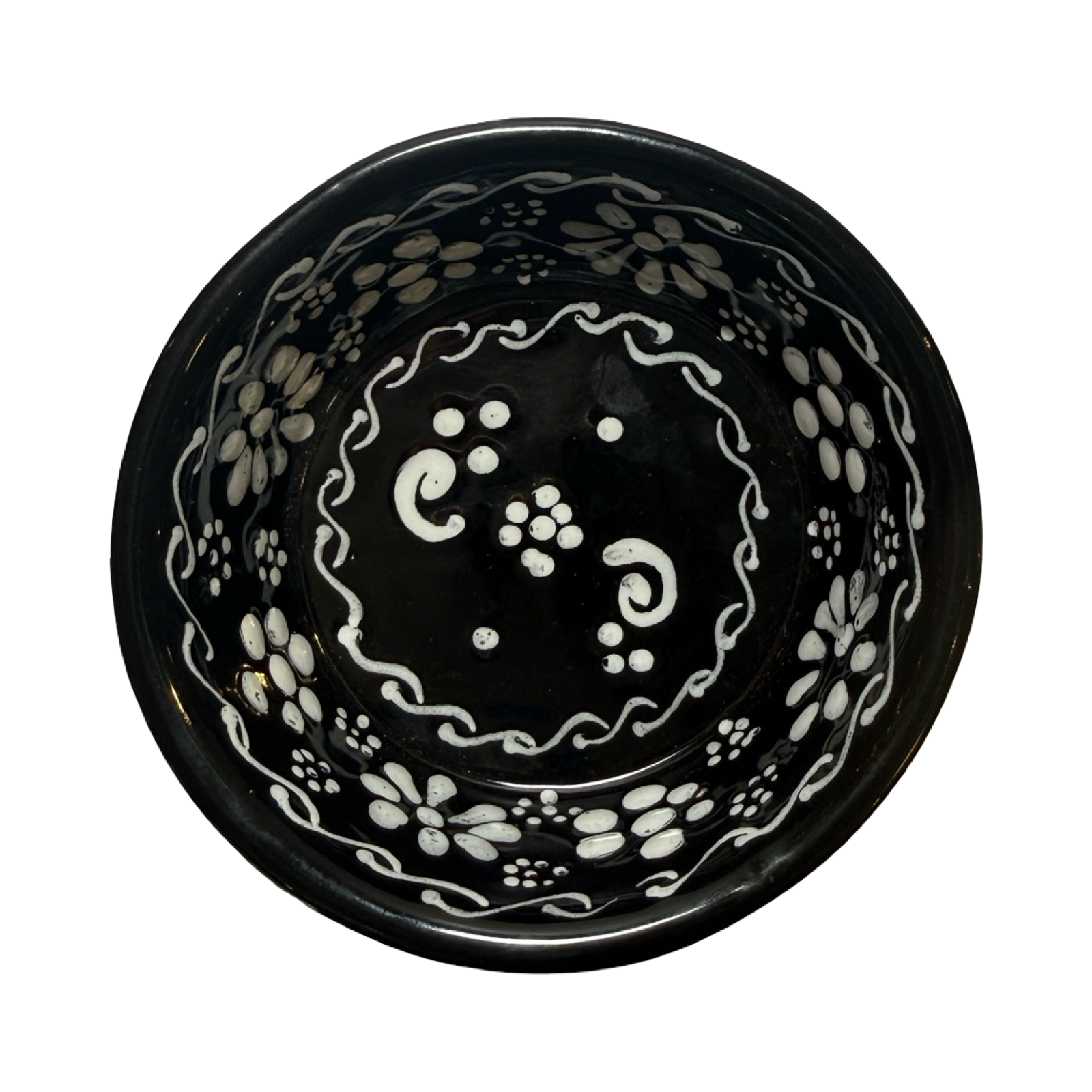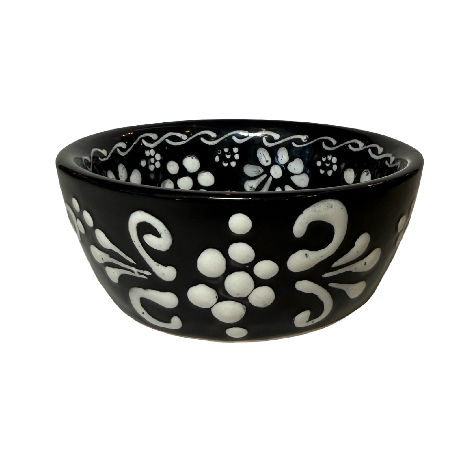 The Encantada Ink Appetizer/Dip Bowl is perfect for serving salsas, sauces, dips, or small snacks in style. Hand-painted in bold black with delicate white floral designs, this ceramic bowl adds elegance and charm to any table. Its versatile size makes it ideal for everyday use or entertaining. Each piece is handmade by skilled artisans, making every one-of-a-kind.