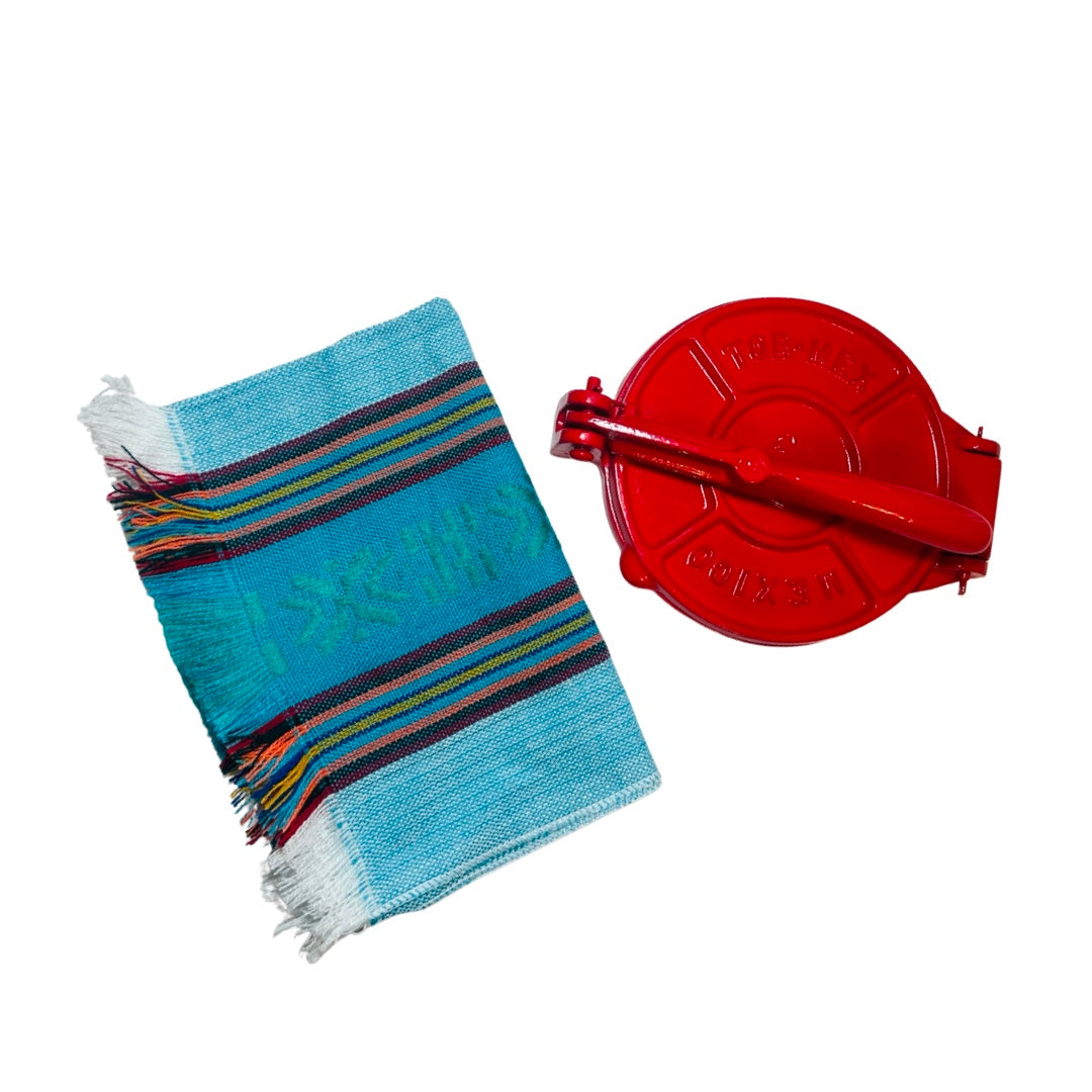 The tortilla press is a fundamental appliance in traditional Mexican kitchens. This beautiful authentic cast iron tortilla press which is powder-coated with this beautiful bright red color is used to make delicious corn or flour tortillas. This set includes a bright and colorful Mexican napkin that can be used to keep your freshly made tortillas warm! This set is a great addition for your kitchen or house warming gift!