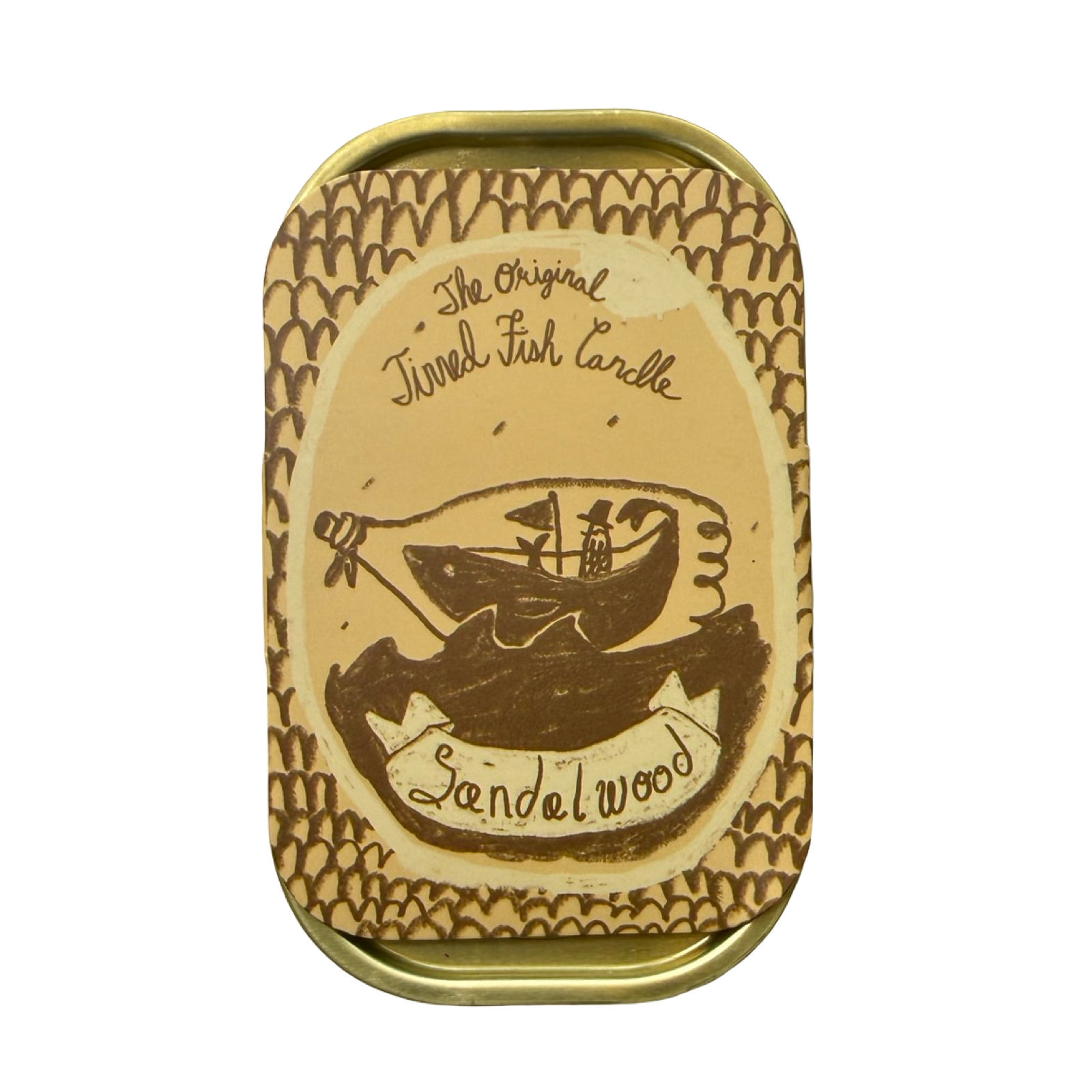 Gold tin Tinned Fish Candle labeled “Sandalwood” with illustrated boat scene and fish design on the front.