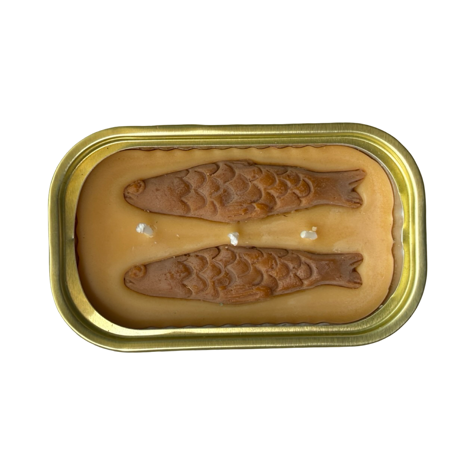 Open gold tin Tinned Fish Candle filled with warm amber wax and two molded fish shapes visible inside.
