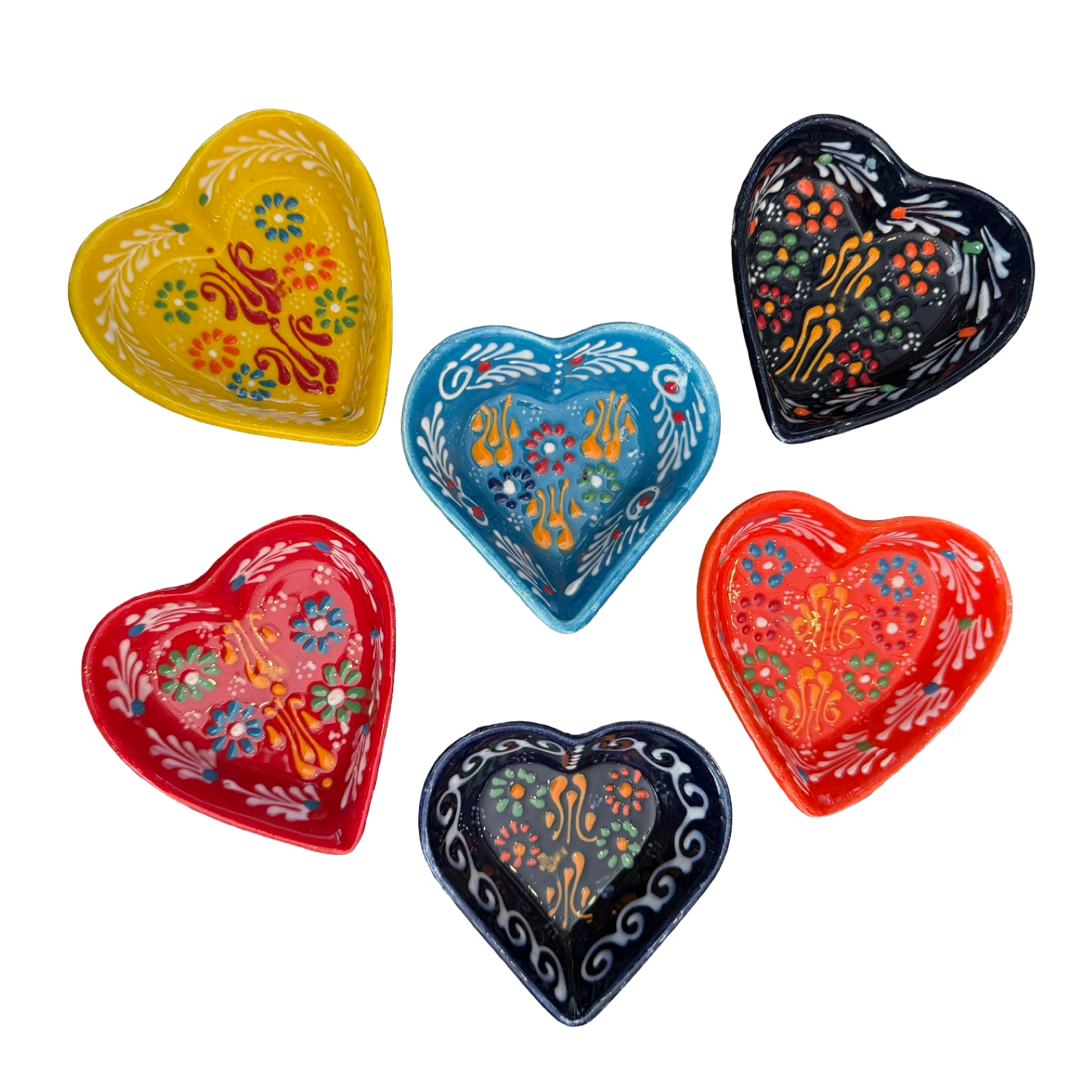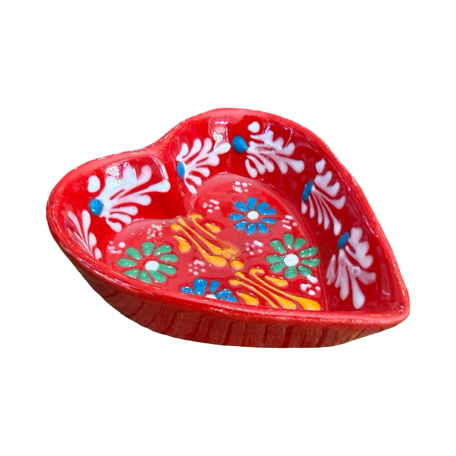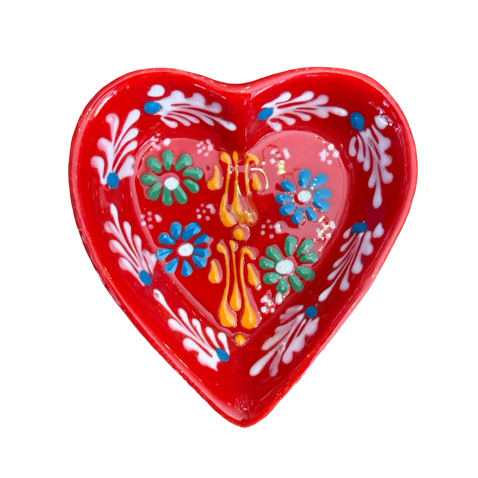 This heart shaped trinket dish is a charming accent for holding rings, earrings, or other small treasures. Handcrafted and hand painted, each dish features delicate floral and decorative motifs inspired by traditional folk artistry. The glossy finish highlights the vibrant details, while the compact size makes it perfect for a bedside table, vanity, or desk. Due to its handmade nature, each piece will have slight variations in design and finish, making every dish one of a kind.
