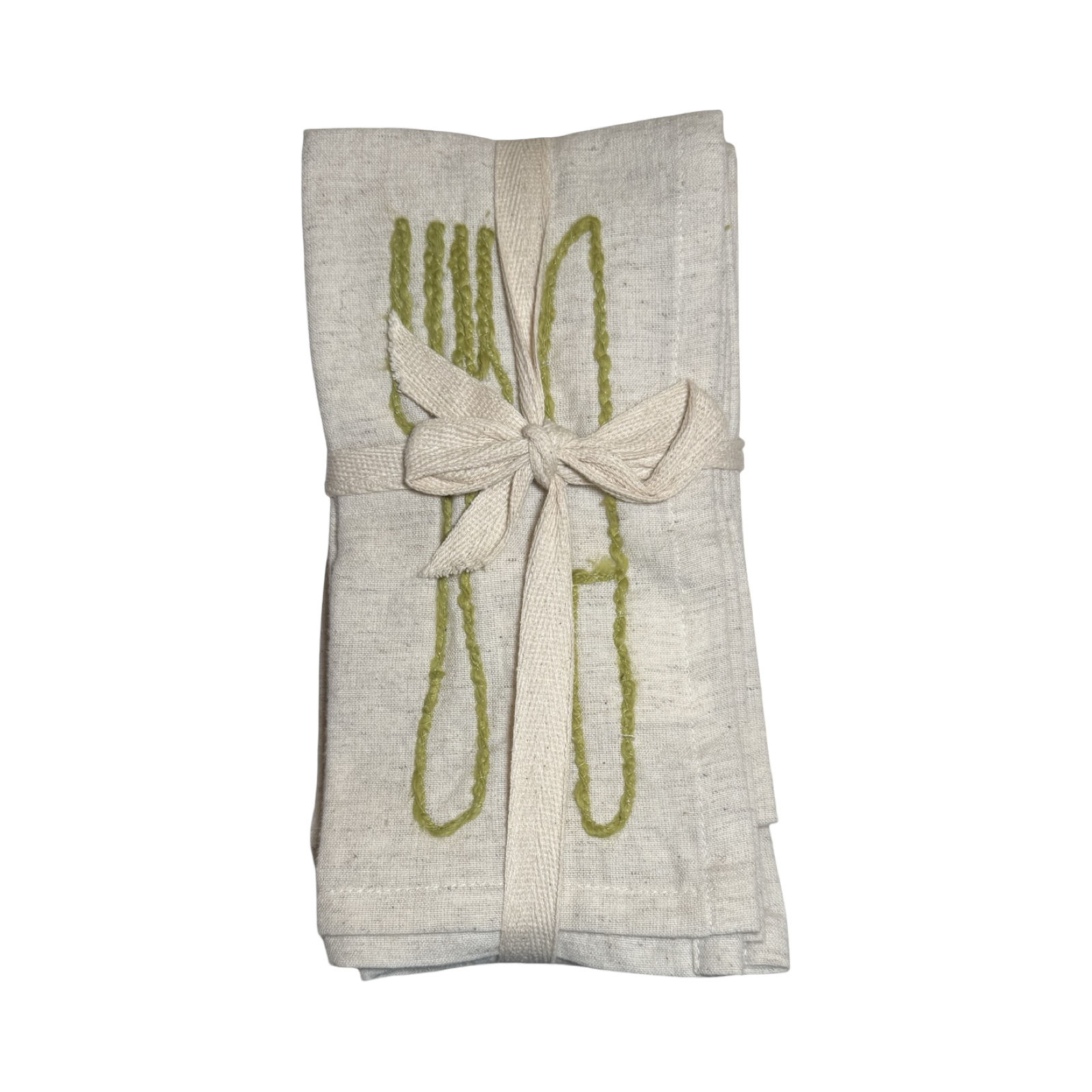 Set of four cotton and linen napkins with embroidered utensil designs in olive green thread color tied with a line ribbon.
