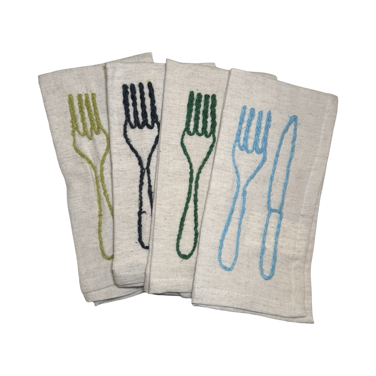 Set of four cotton and linen napkins with embroidered utensil designs in assorted thread colors.